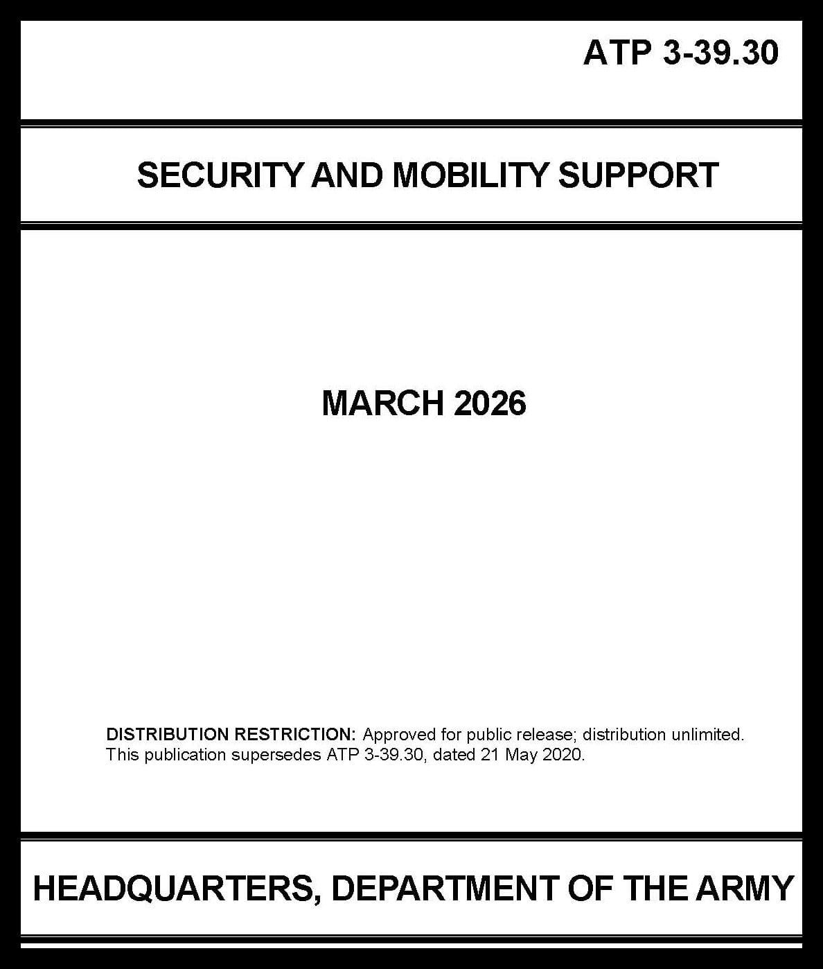 ATP 3-39.30 focuses on the military police discipline of security and mobility support. It outlines how military police assist Army, joint, and multinational forces by carrying out tactical tasks and activities related to security and mobility. ATP 3-39.30 serves as a foundation for military police commanders, staffs, and Soldiers to effectively conduct security and mobility support across various military operations. The primary emphasis is on the tactical tasks and activities facilitated by military police technical capabilities that enable commanders to generate, project, and maintain combat power. ATP 3-39.30 describes the role of military police in protecting both the force and noncombatants, and how they help ensure that the commander’s freedom of action is preserved.