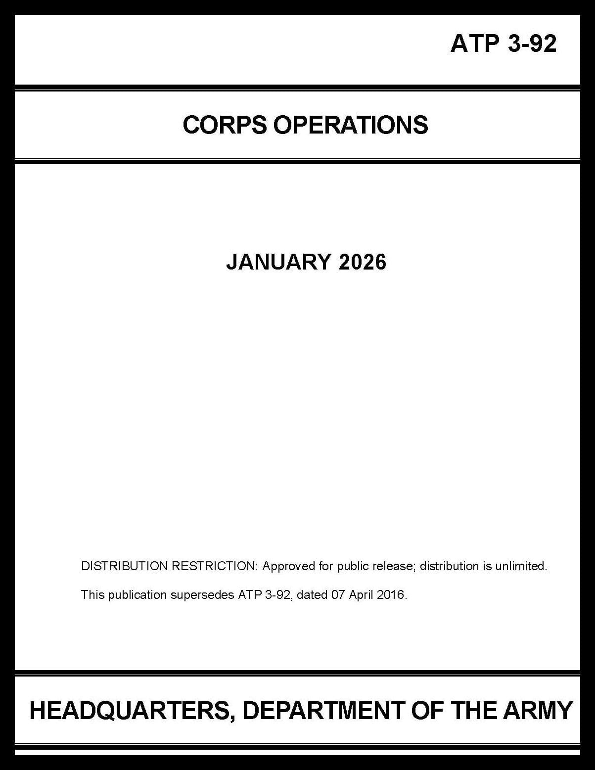 ATP 3-92 Corps Operations discusses the roles, functions, structure, organization, and operations of the corps. This publication discusses the corps as a tactical formation and operational headquarters during operations. This publication contains copyrighted material.