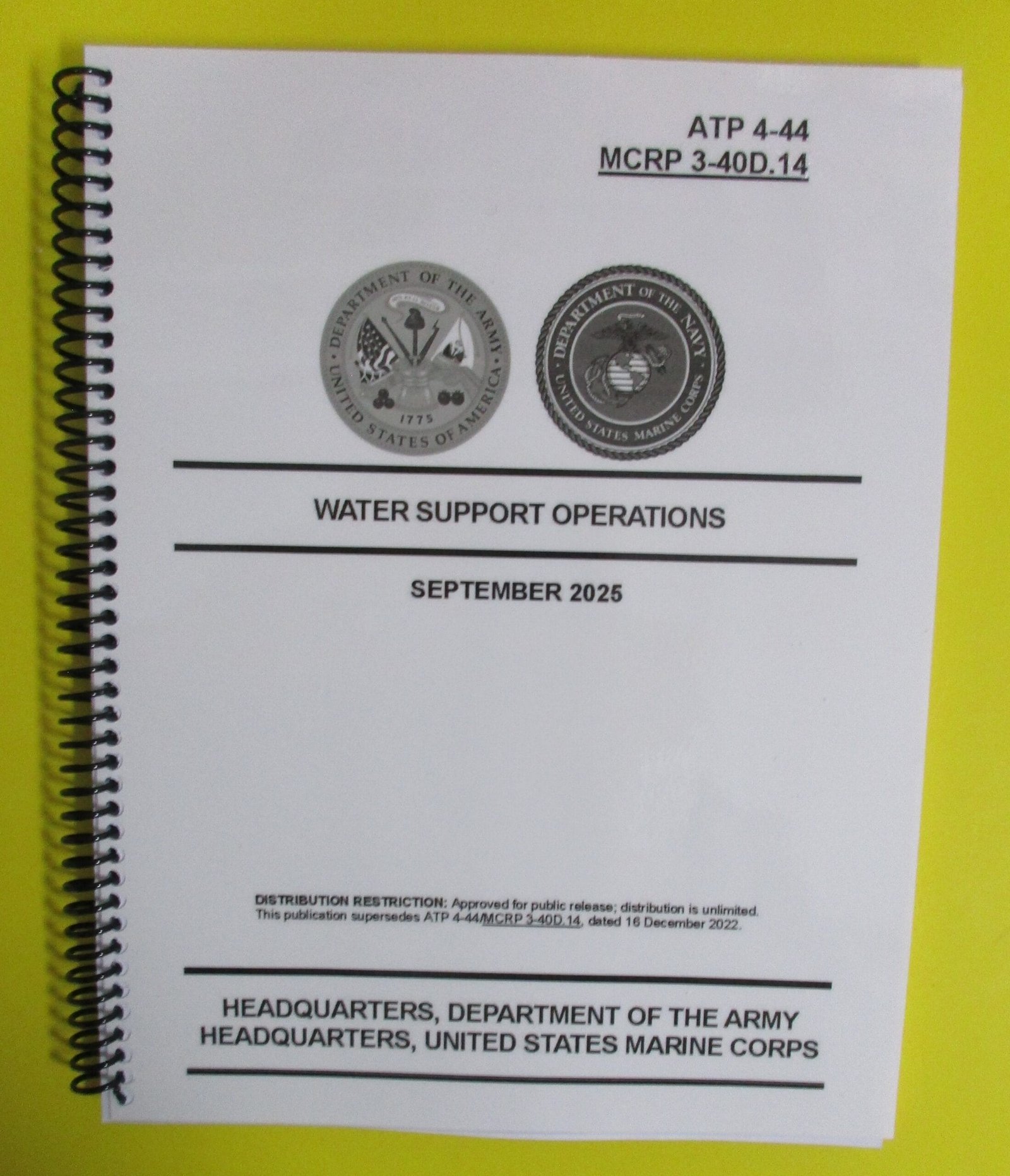 ATP 4-44/MCRP 3-40D.14 is the United States Army and United States Marine Corps manual for planning and executing water support for missions conducted across the full conflict continuum. Water support operations include water treatment, storage, and distribution. Water support operations are critical to the United States Army and United States Marine Corps; they directly impact the depth and duration of military operations.