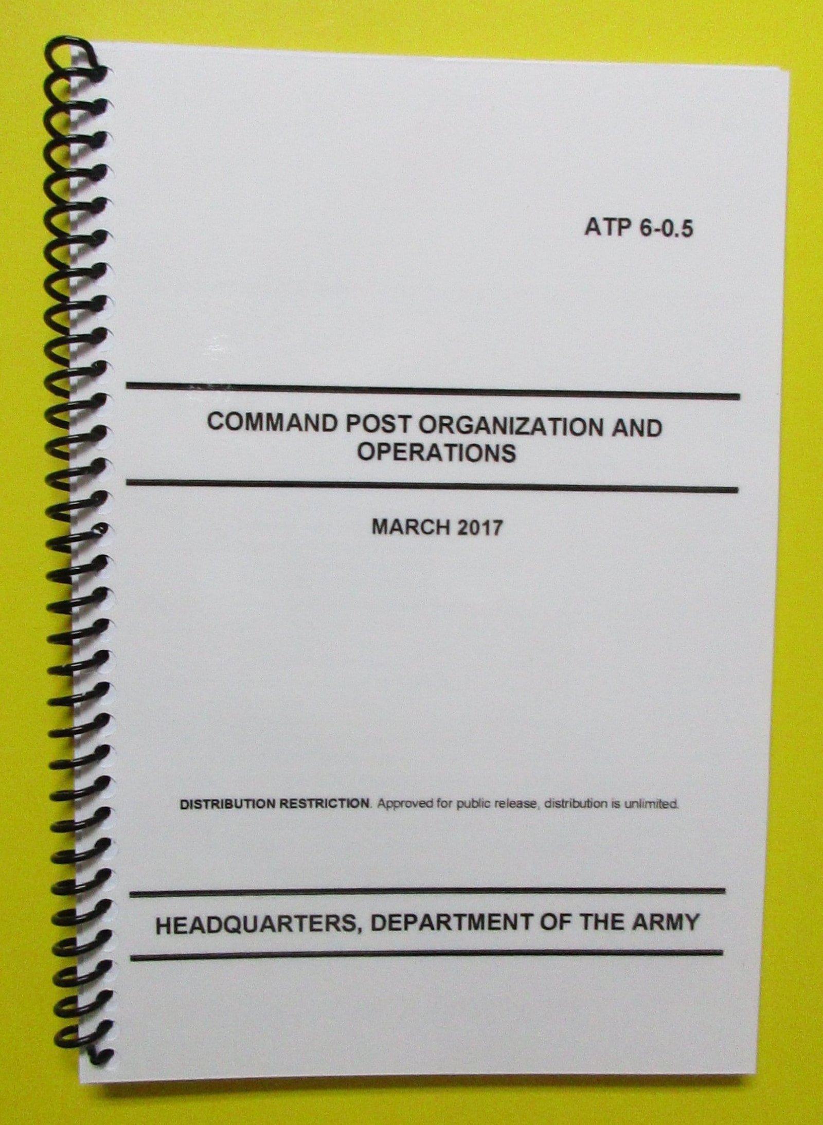 ATP 6-0.5 Command Post Organization and Operations expands on command post (CP) tactics and procedures found in FM 6-0. This publication provides considerations for organizing a headquarters into CPs and techniques for employing and conducting CP operations. The material in this publication provides a framework for units to develop and refine their standard operating procedures (SOPs) for CP operations.