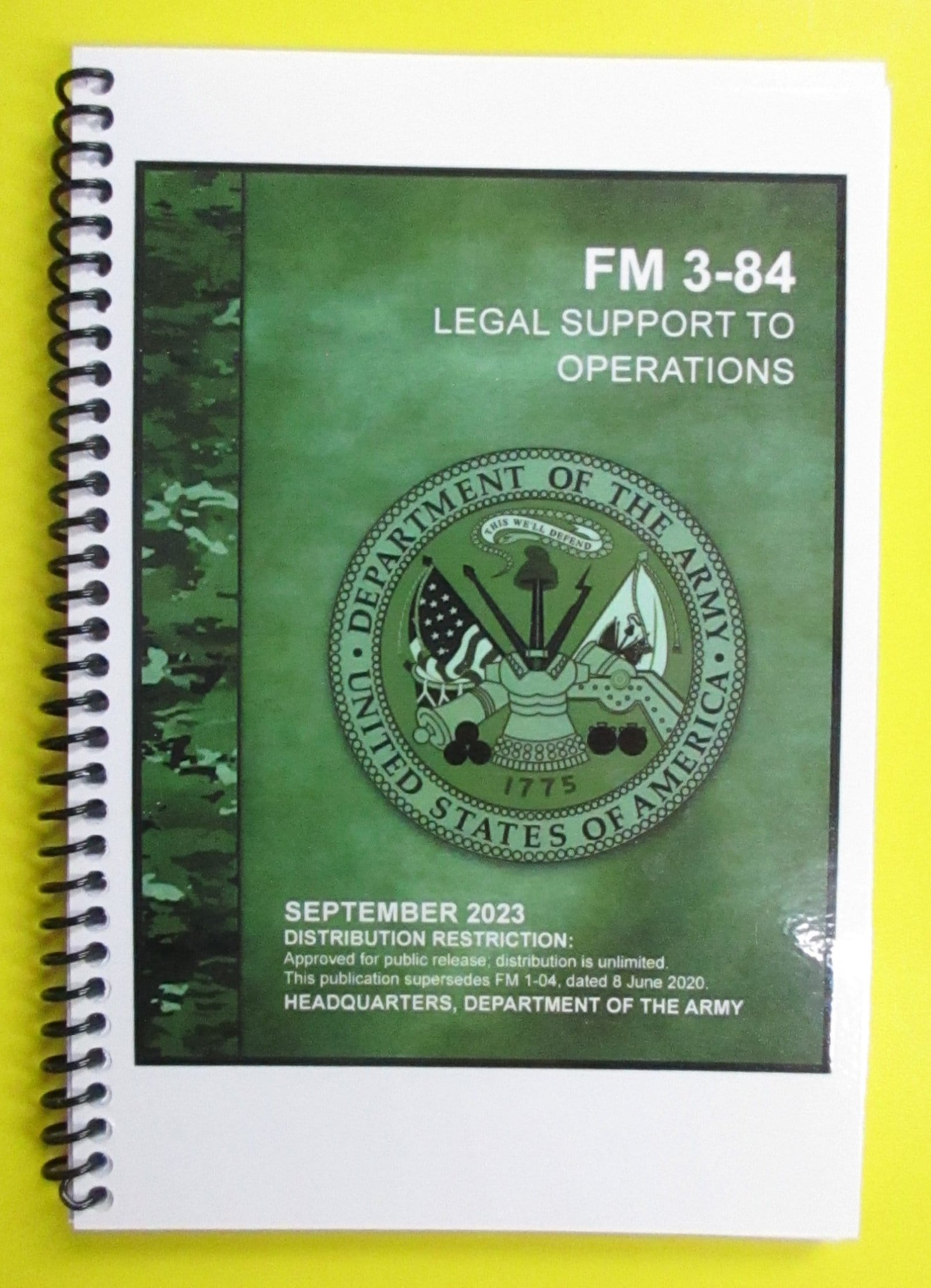 FM 3-84, Legal Support to Operations, is the Army’s manual for operational legal doctrine. This manual provides authoritative doctrine and practical guidance for commanders, judge advocates, legal administrators, paralegal Soldiers, and Department of the Army Civilian legal personnel across the range of military operations, during competition below conflict, crisis, and armed conflict. It outlines how the Judge Advocate General’s Corps is organized in accordance with the Army’s force design. It also discusses the delivery of legal support to the force.