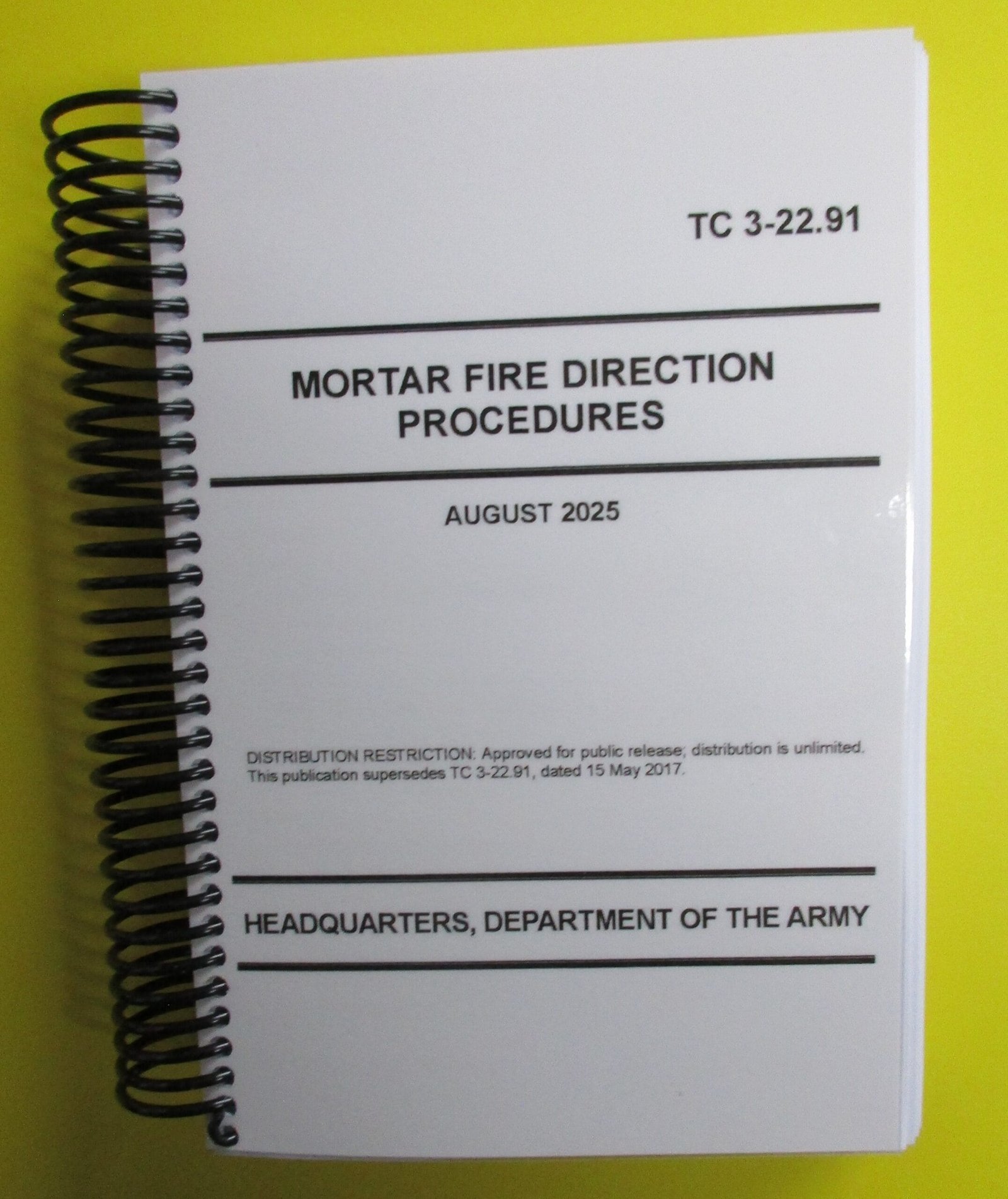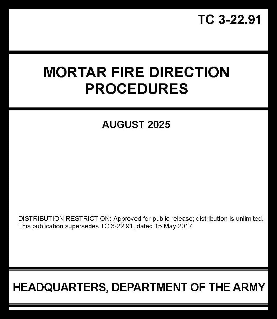 TC 3-22.91 guides military occupational specialty 11C Soldiers and their trainers on the employment of the 60-millimeter (mm) mortar (M224), 81-mm mortar (M252), and 120-mm mortar (M120/M121). It discusses the practical applications of ballistics and a system combining the principles, techniques, and procedures essential to the delivery of timely and accurate mortar fire.